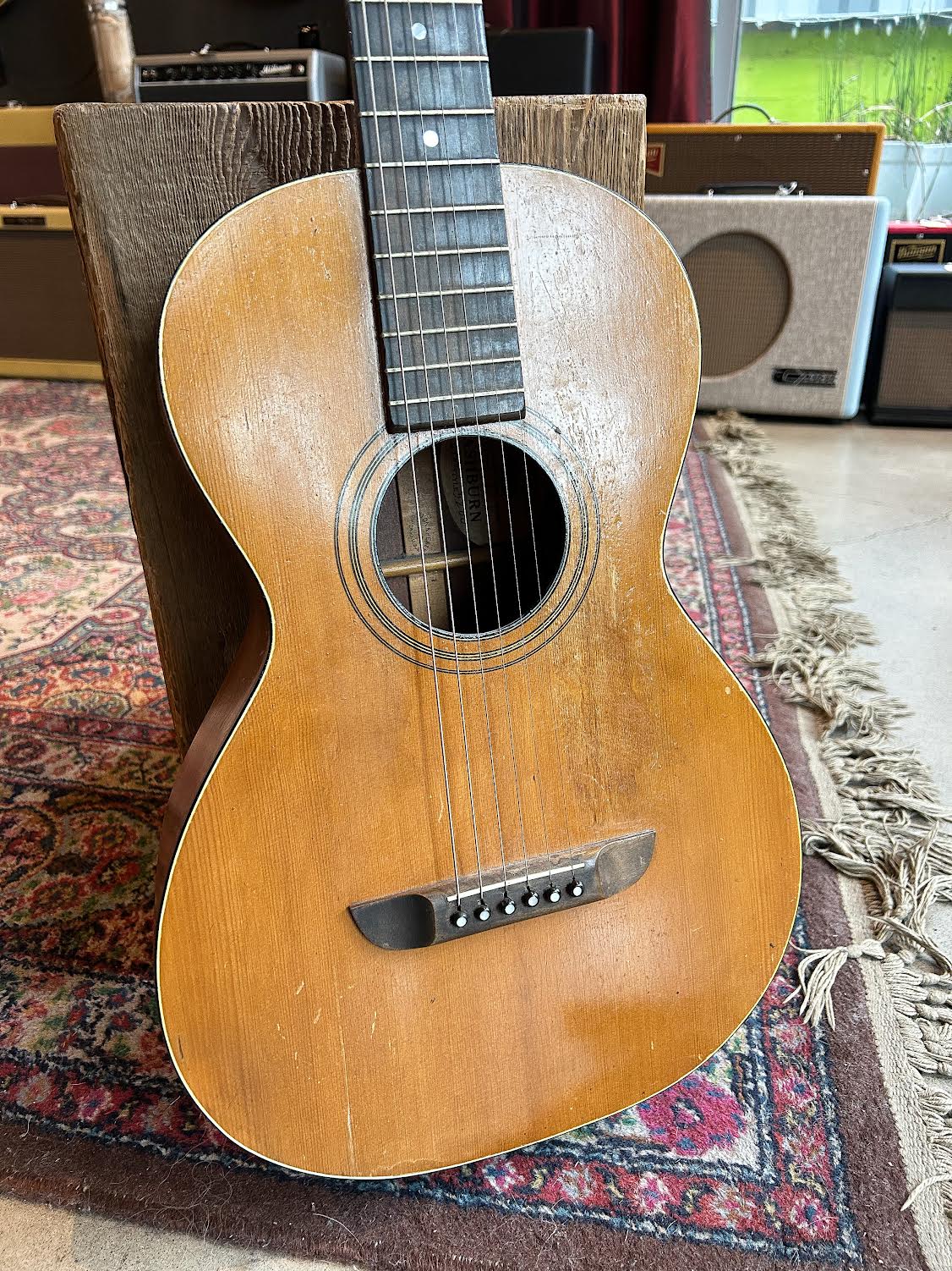 This 1930’s era Washburn Style 5200 is the classic Turn of the Century Parlour style presentation. LOTS of character- exhibits plenty of natural player wear- but nothing abusive. The sound is open, immediate and woody. Everything you’d want a parlour from this era to be! Nut wdith= 1.73″, and the neck profile is a typical “V” seen during this era. Thickness at the 1st fret=.91″ and at the 9th fret= 1.02″. On the large side but nonetheless very comfortable. Frets appear original and show wear, but this plays very well with action set at a very comfortably low range. Neck and bridge sets appear to be original. Original label is present, indicating manufacture in Chicago.