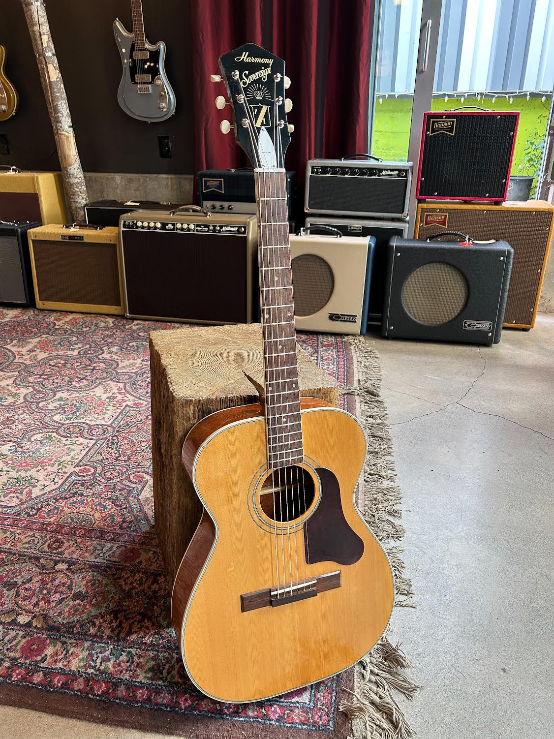 This 60’s Harmony Sovereign H1203 is very rare find in this condition! We’ve all seen our share of gutted, destroyed and dull Harmony Sovereign’s so this is a very unusual and surprising example. No work has been done on it- and it’s amazing as it is. LOUD, resonant, original frets feel great, the original finish is very clean- as if it came right out of the showroom. Nut width= 1 3/4″, and this has medium chunky neck that is very comfortable (and clean!). Neck thickness measures out at the 1st fret= .91″ and at the 12th= .99″. Rosewood fingerboard and bridge. Spruce top and mahogany back/sides. No conversion needed- this is a real beauty exactly as it is!